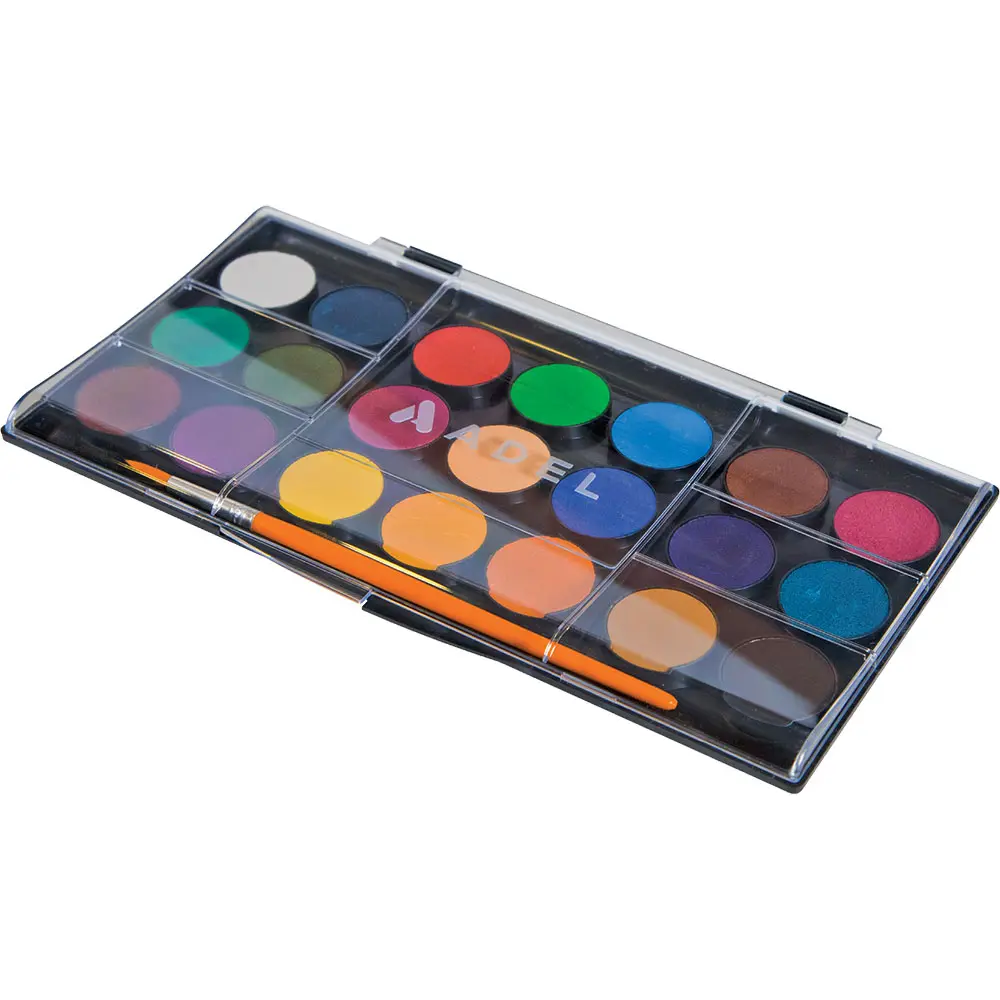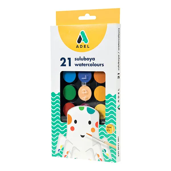 Акварелни бои Adel ви дават всичко необходимо: голяма пластмасова кутия, една четка и 21 красиви акварелни таблетки. Размер на тавичката Ø 30 мм. Можете да обърнете капака и да го използвате, за да смесите боята си в него за по-голяма креативност.