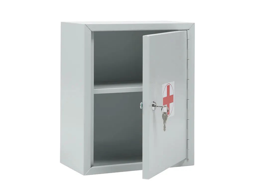 Аптечката PMT 33 предлага надеждно място за съхранение на лекарства и комплекти от първа необходимост на работното място. Металната аптечка е подходяща за поставяне на стена.