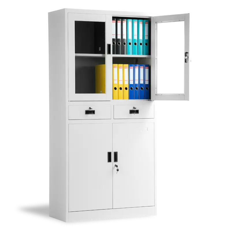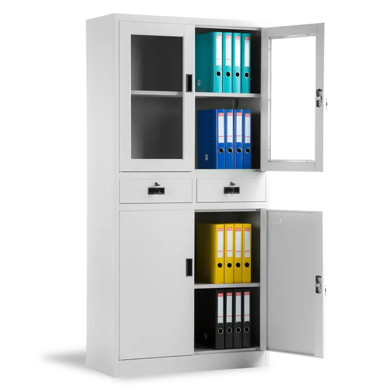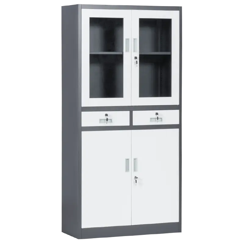 Архивен шкаф BTL LZ с 4 отделения 185х90х40 см за документи е функционално и надеждно решение за съхранение във всеки офис. Той е изработен от праховобоядисан метал с пясъчно покритие, което осигурява здравина и устойчивост. Комбинираните врати съчетават стъклени и плътни панели за удобен достъп и защита на документите. Шкафът разполага с две чекмеджета и два регулируеми рафта с товароносимост до 40 кг на рафт. Вместимостта му достига 48 стандартни класьора формат А4 с широчина 7 см.