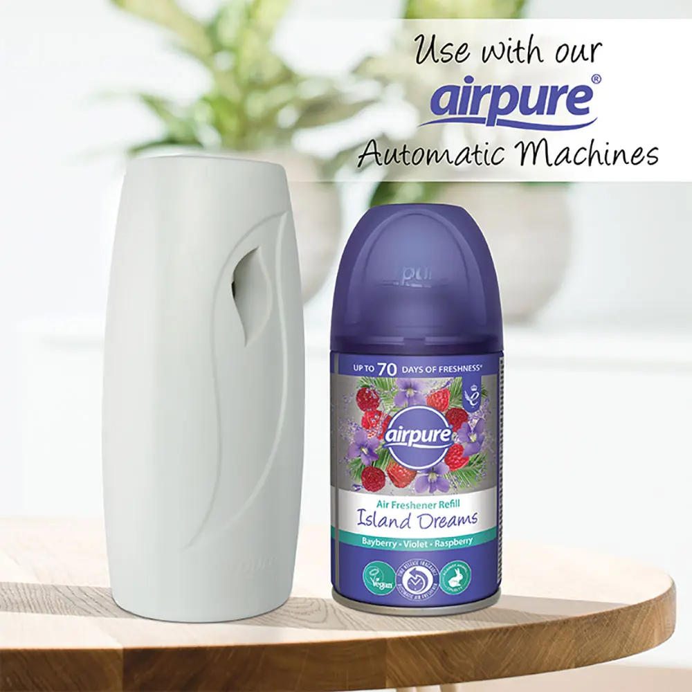 Автоматичният диспенсър Airpure е създаден за удобно и ефективно използване на пълнители от 250 мл. Осигурява равномерно разпръскване на аромата през определени интервали от време, като създава дълготрайна свежест във всяко помещение. Машинката е съвместима с всички стандартни пълнители Airpure, AIR WICK и други 250 мл аерозоли. Подходяща е за дома, офиса, банята, коридори или обществени пространства.