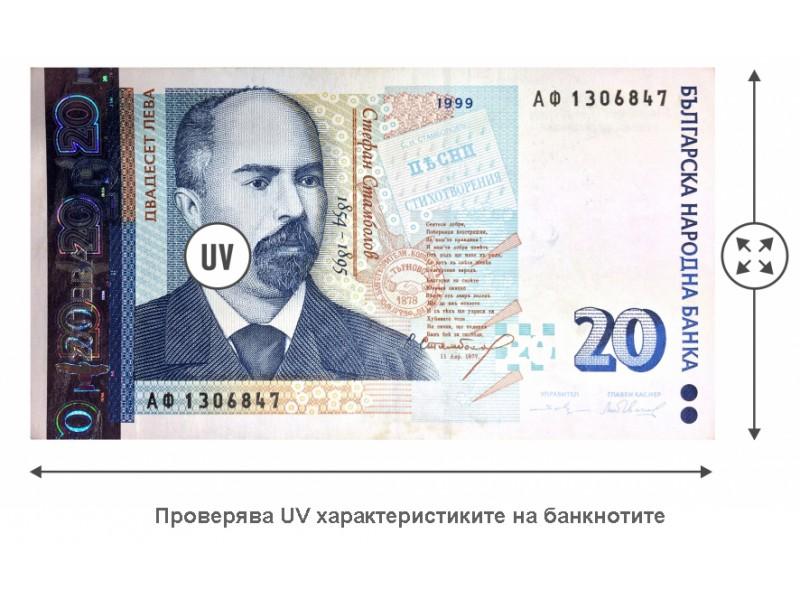 - Проверява банкнотите по до два защитни елемента: ултравиолетово мастило и размер