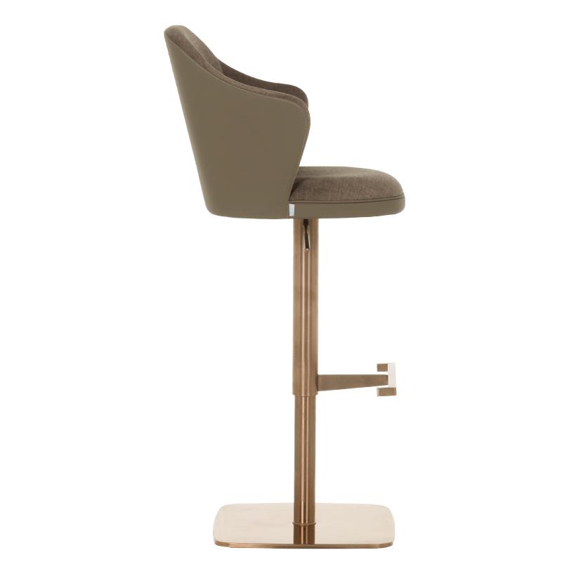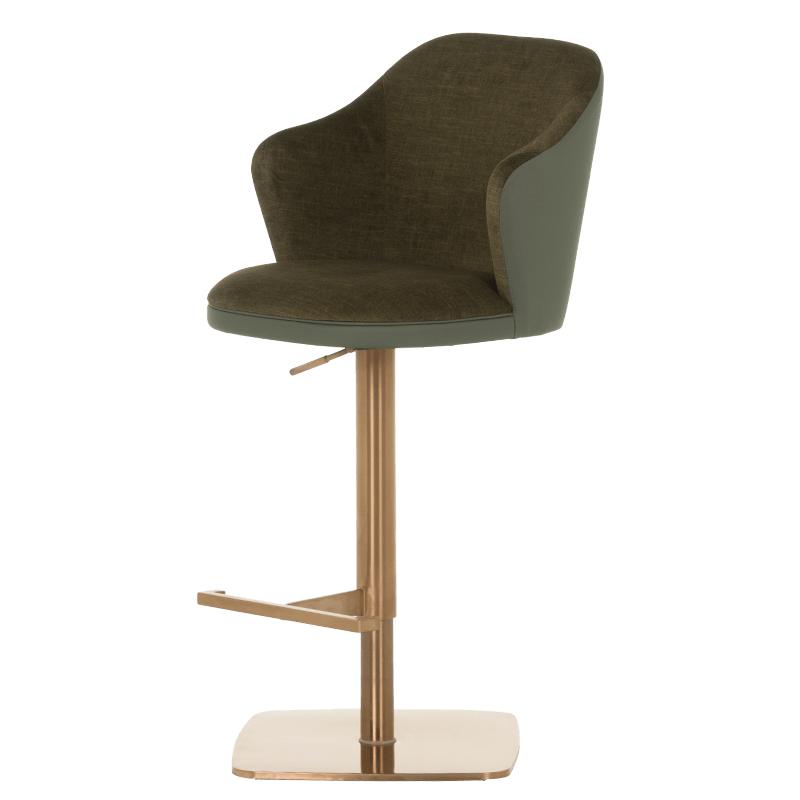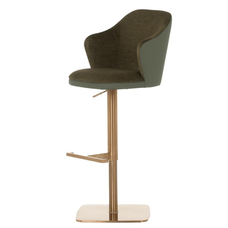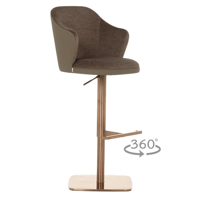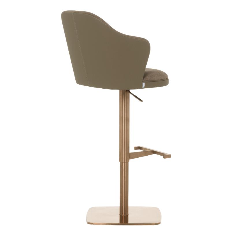 Бар столът БЛАГО е съвършеното въплъщение на лукс и комфорт, съчетавайки модерен дизайн с функционалност. Тапициран във висококачествена еко кожа, той предоставя несравнима мекота и елегантност, създавайки изискана атмосфера. Основата му е изработена от иноксова стомана с луксозно полирано покритие със златист финиш, което придава както забележителна издръжливост, така и изискан блясък. Подлакътниците се преливат плавно с облегалката, създавайки стилна извивка, която подчертава хармоничния и елегантен силует на стола. С въртене на 360 градуса и регулируема височина, бар столът предлага както функционалност, така и изтънчен визуален акцент за всеки интериор, където комфортът и стилът се преплитат в съвършена хармония.