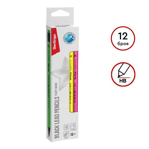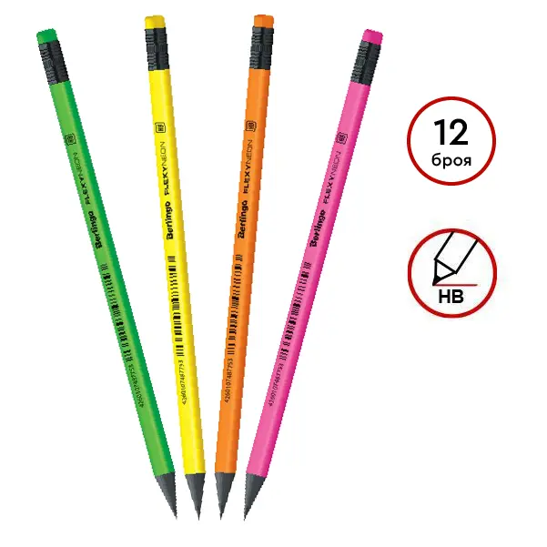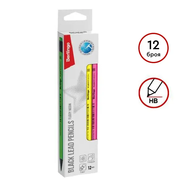 Berlingo Neon НB комплект 12 броя са практични и удобни графитени молив. Твърдостта на графита е НВ и е подходящ за писане и рисуване. Той е пластмасов и гъвкав, а формата му е триъгълна и удобна за хващане. Той е с гумичка, графитът е с диаметър 2.2 мм и е 19 см.