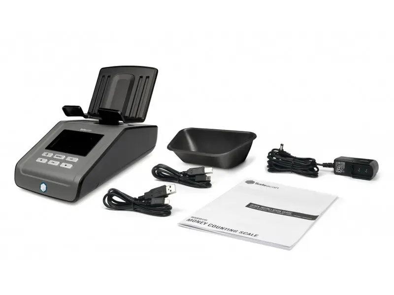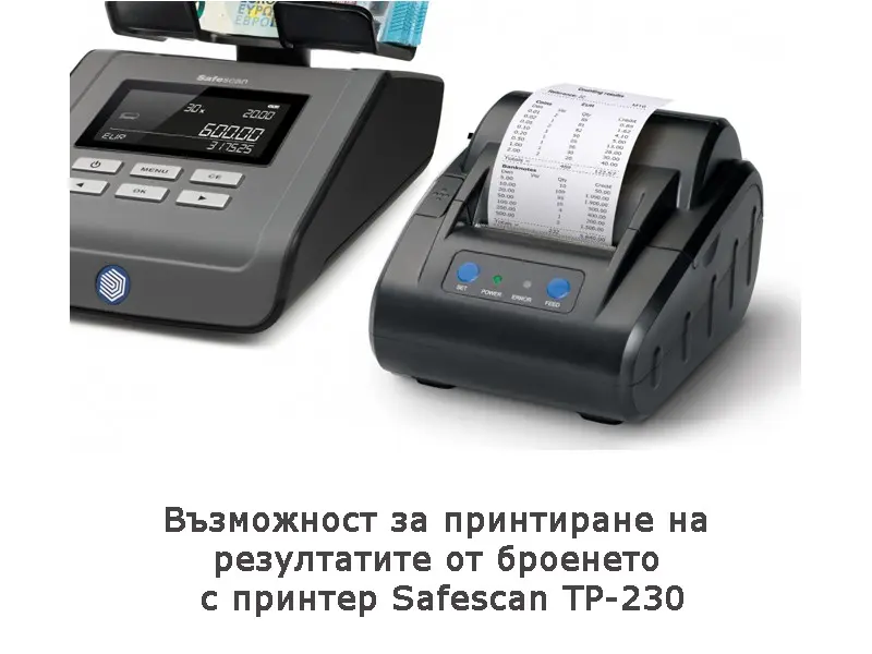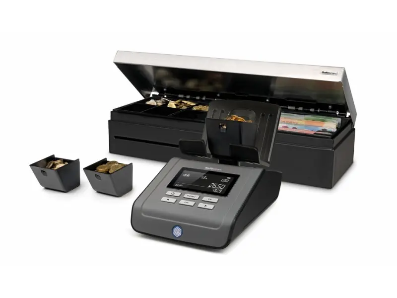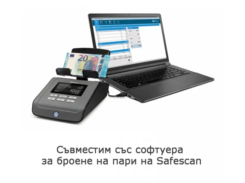Safescan 6165 безпроблемно брои монети, банкноти, фитили от монети и пачки от банкноти от 13 различни валути. Разполага с функциите автоматично да добавя преброените монети/банкноти към общата сума и автоматично да преминава към следващата номинална стойност, след като премахнете монетите/банкнотите от платформата. В допълнение може да зададете начална сума, която винаги да имате в касата и след това машината автоматично ще я приспадне от общата преброена сума.