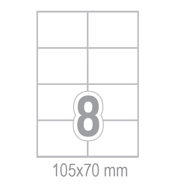 Самозалепващи етикети 105x70 8 бр. са произведени от смозалепваща хартия за многофункционална употреба. Подходящи са за работа с копирни машини, лазерни и мастиленоструйни принтери.