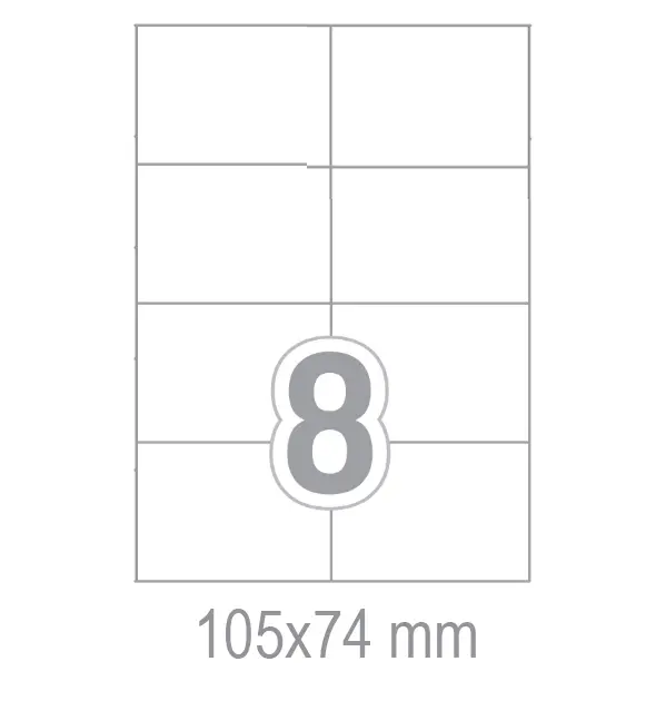 Самозалепващи етикети 105x74 8 бр са произведени от смозалепваща хартия за многофункционална употреба. Подходящи са за работа с копирни машини, лазерни и мастиленоструйни принтери.