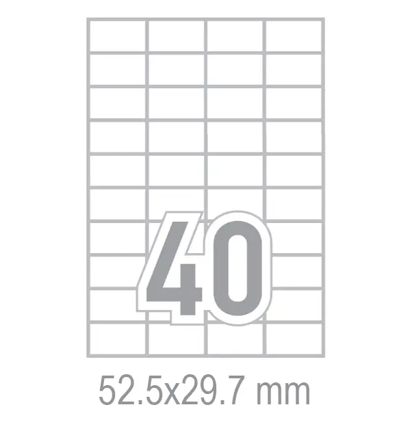 Самозалепващите етикети 52.5x29.7 40 бр. са произведени от самозалепваща хартия за многофункционална употреба. Подходящи са за работа с копирни машини, лазерни и мастиленоструйни принтери.