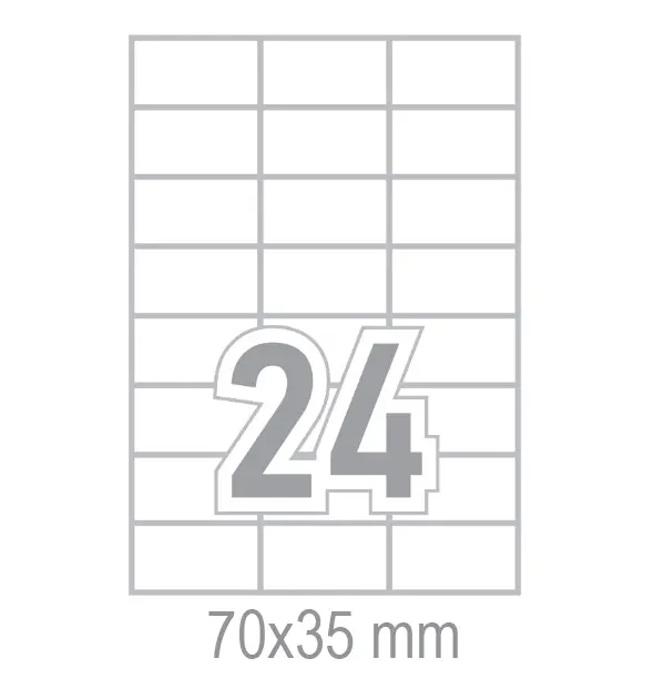 Самозалепващите етикети 70x35 24 бр. са произведени от смозалепваща хартия за многофункционална употреба. Подходящи са за работа с копирни машини, лазерни и мастиленоструйни принтери.