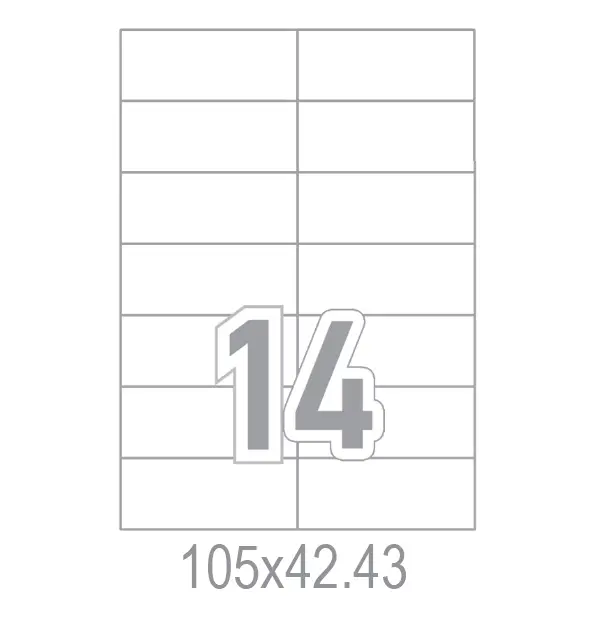 Самозалепващи етикети 105x42.43 14 бр. са произведени от самозалепваща хартия за многофункционална употреба. Подходящи са за работа с копирни машини, лазерни и мастиленоструйни принтери.