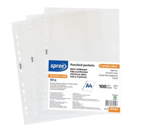 Джобът е подходящ за всички папки и класьори, защото притежава универсална перфорация. за документи А4 кристал 45 микр 100 бр