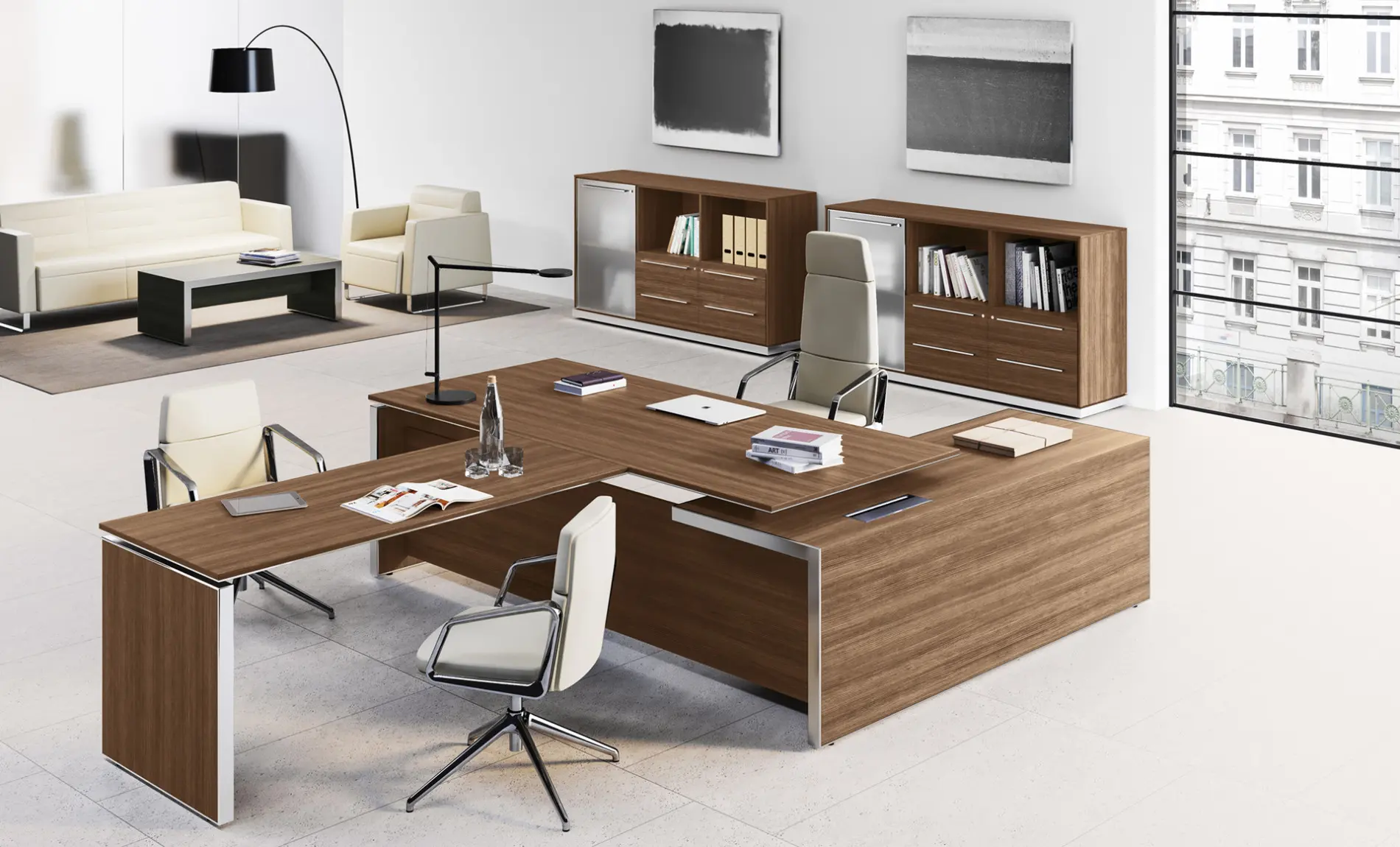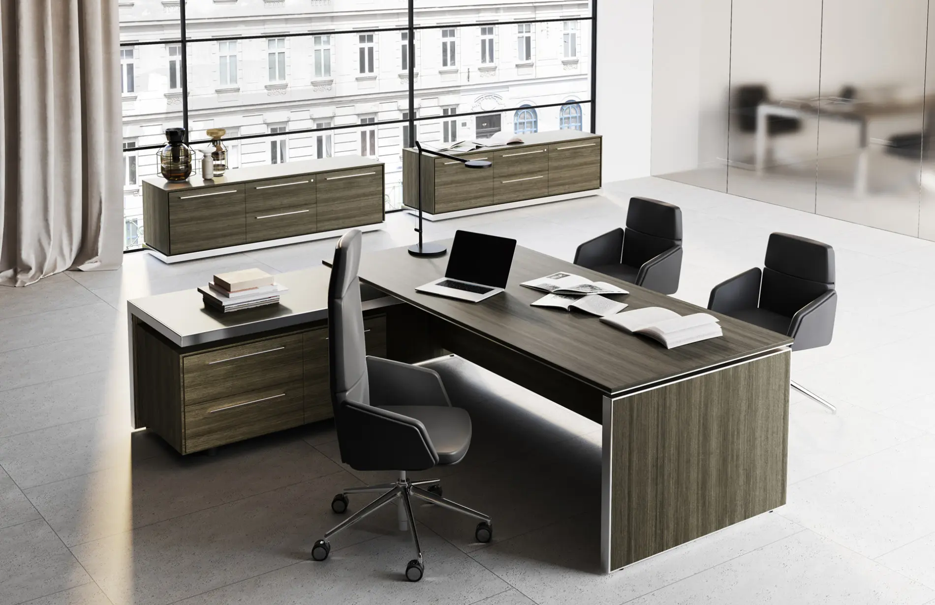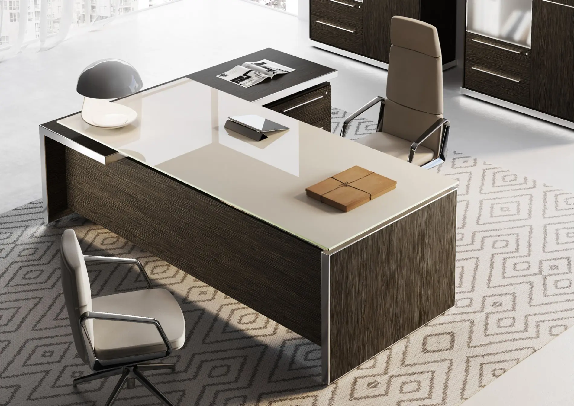 Директорски кабинет E.O.S е създаден от италианските дизайнери Giacobone и Roj, които умело са имплементирали геометрични фигури и масивност в облика на кабинета. Масите от серията E.O.S могат да бъдат изработени от закалено стъкло или ПДЧ с меламиново покритие. Шкафовете са оборудвани с механизъм за тихо затваряне и са придружени от централно заключване. Също така кабинетът разполага и с помощно бюро и приставка, които формират надеждна Г-образна структура. Бюрата притежават и скрита от полезрението система за окабеляване, която ще ви даде възможност да зареждате мобилните си устройства и лаптопи.