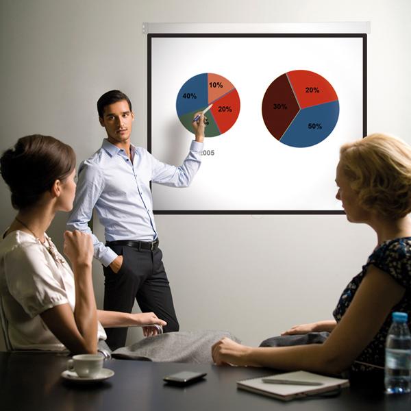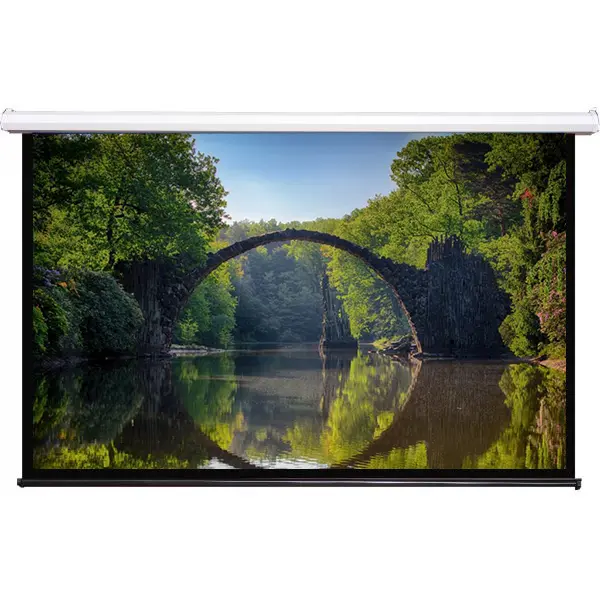 Екран за стена е с размер на изображението 150х150 см и черен корпус, което го прави функционален и елегантен. Удачен е за стенен или таванен монтаж в училища и бизнес офиси. Идеален е за несрещно прожектиране.