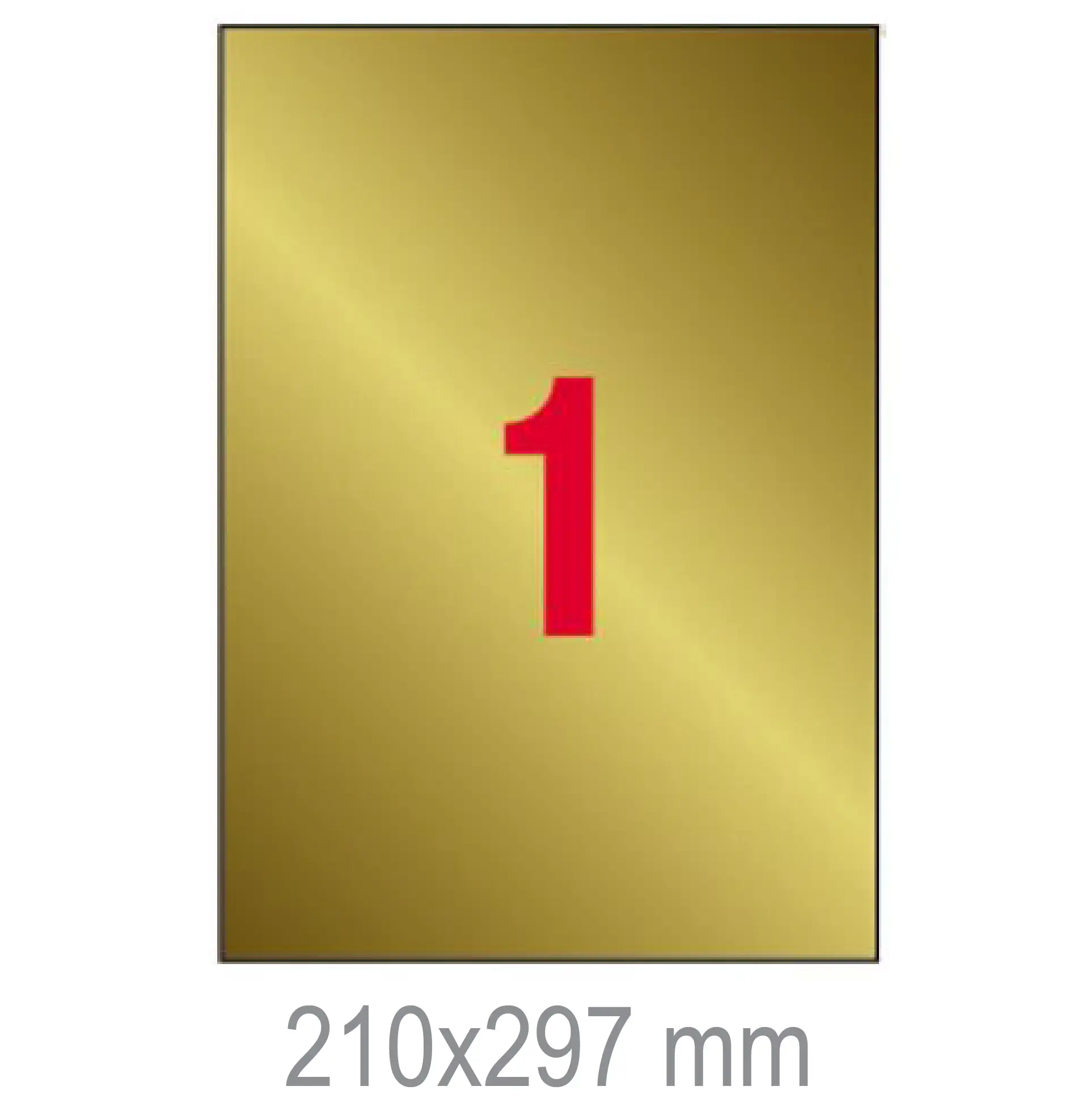 Полиестерни етикети злато 210х297 мм са водоустойчиви златисти етикети, които са подходящи за лазерни принтери и копирни машини. Идеални са за етикетиране на елементи, подложени на лошо време и температури от - 20º до +100º.