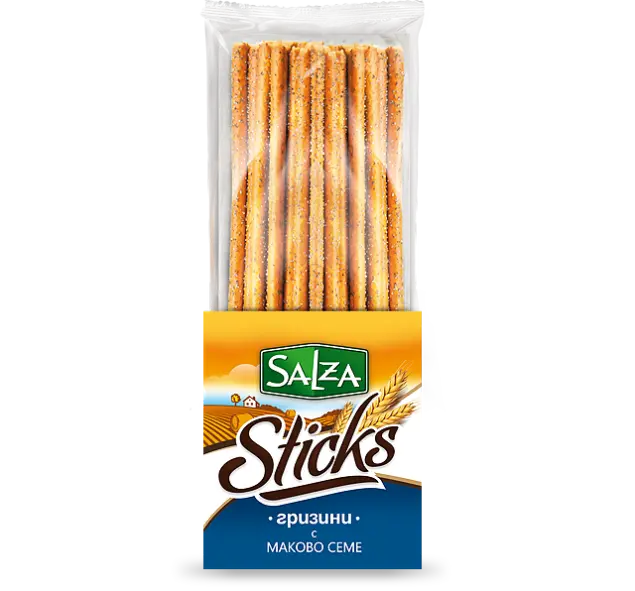 Гризини Sticks с маково семе. Вкусни хлебни пръчици с размери на молив. Без консерванти. Без оцветители. Без хидрогенирани мазнини. Без изкуствени подсладители.