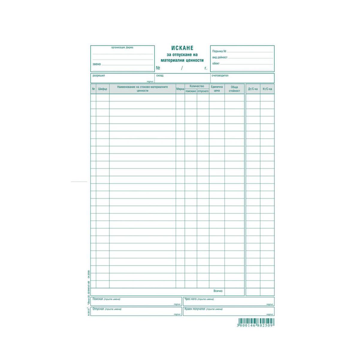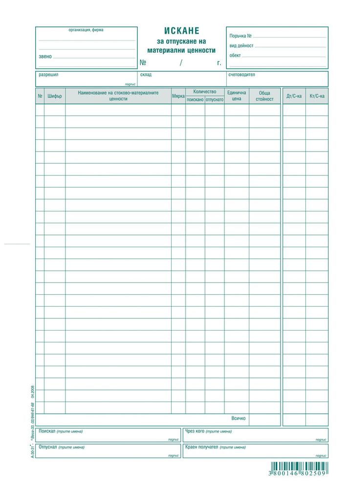 - Искане за отпускане на материални ценности (МЦ и материални запаси, МЗ)
