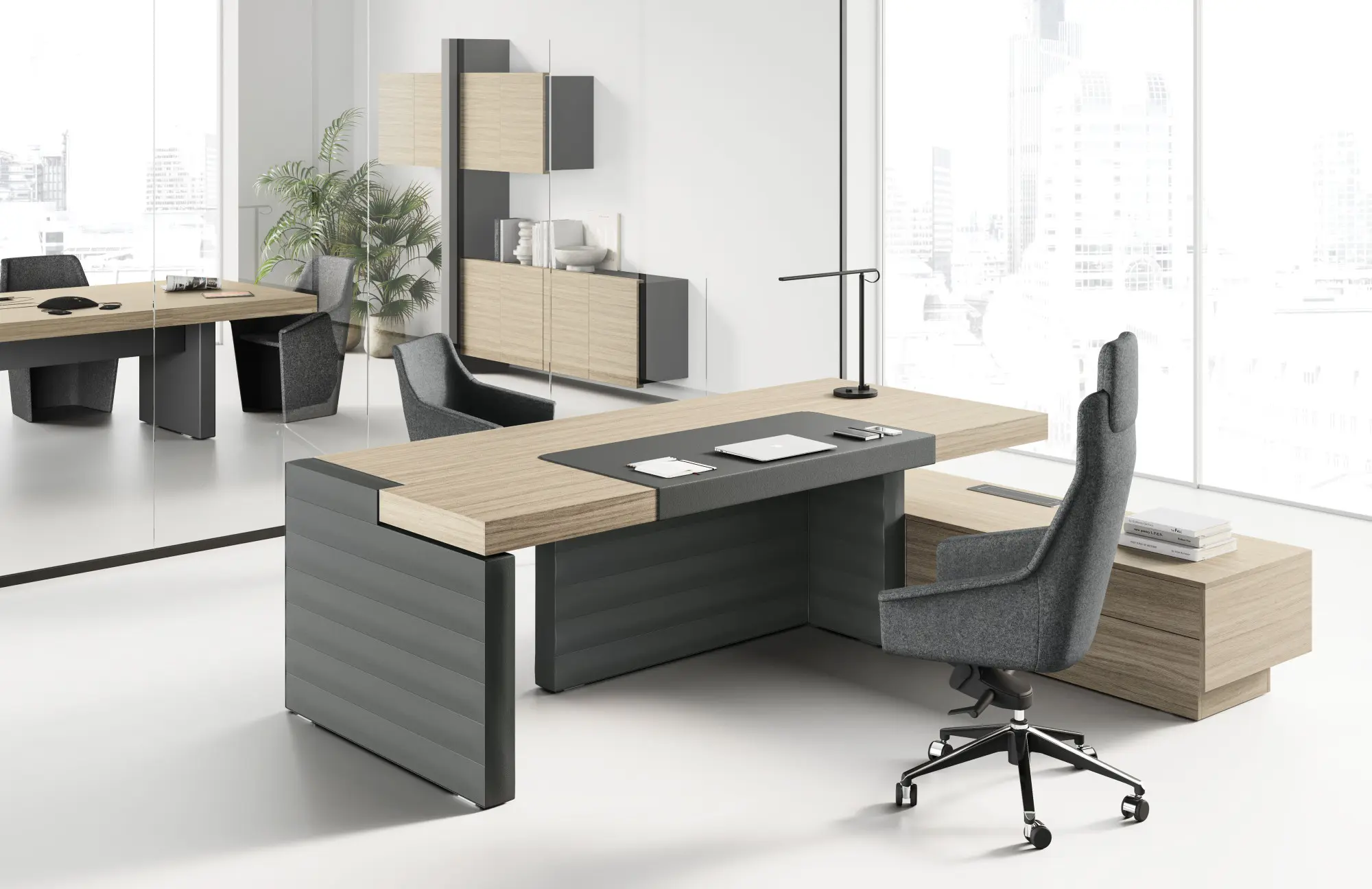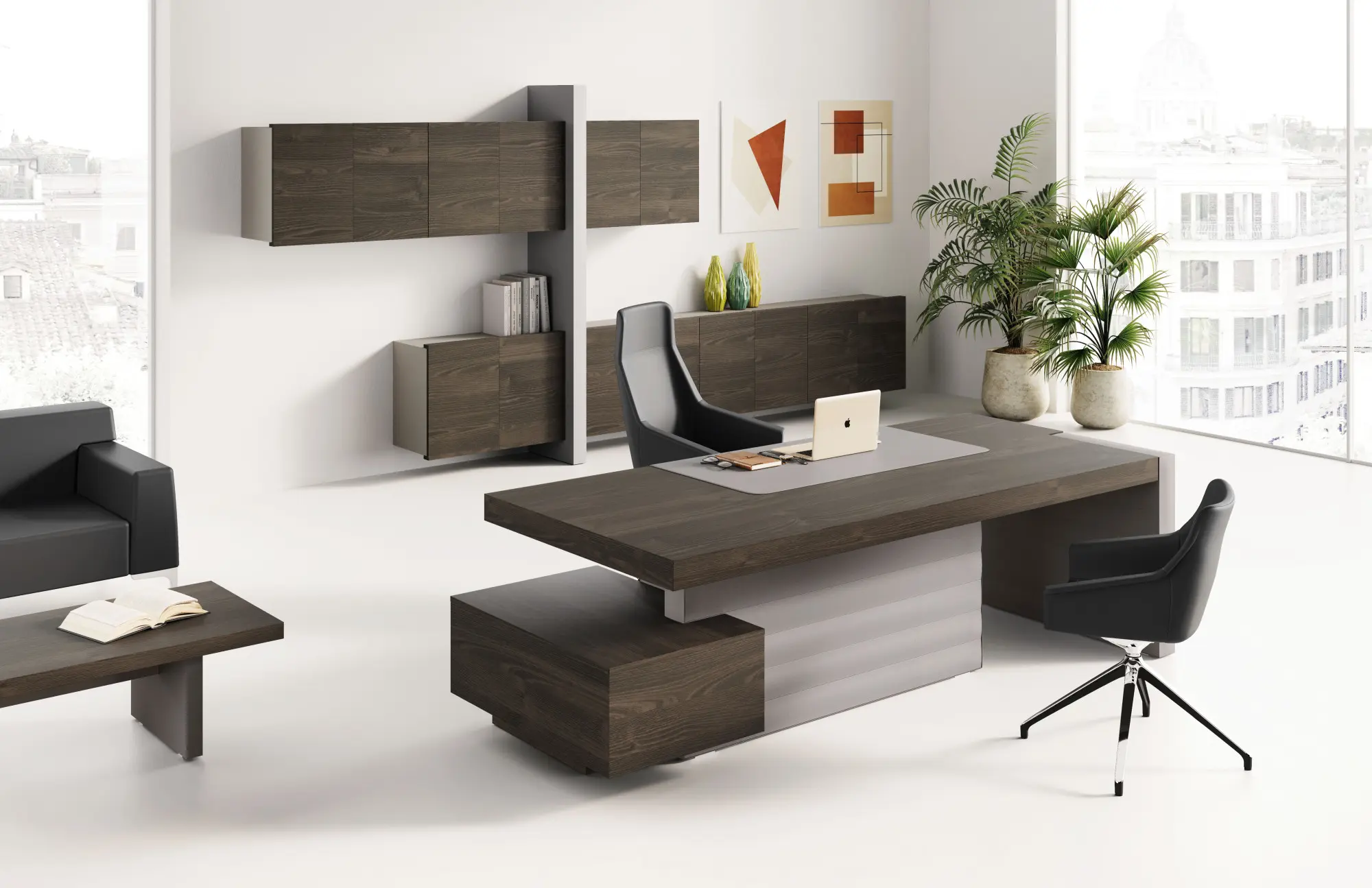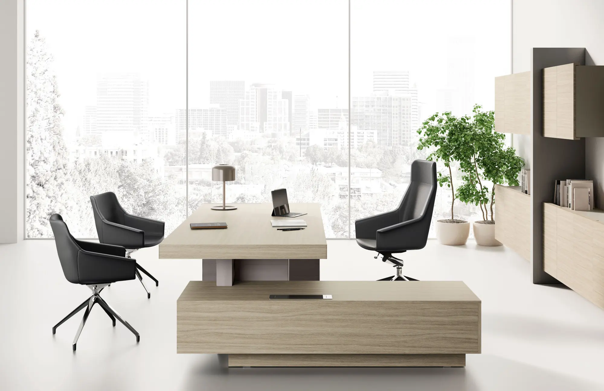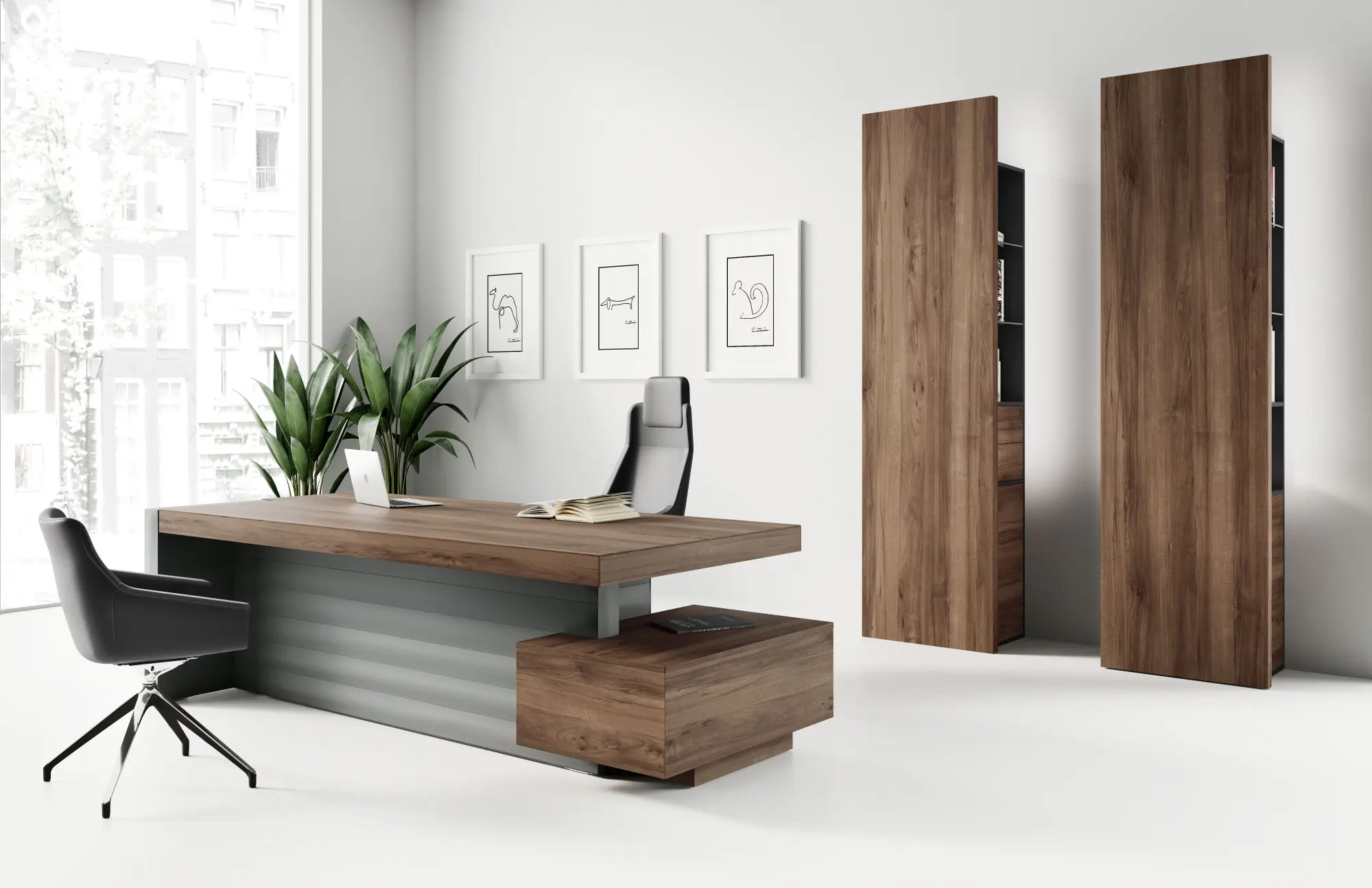 Директорския кабинет JERA съчетава изчистени и строги линии със съвременни материали, като създава усещане за уют и комфорт на работното място. Солидното и масивно бюро в комбинация със страничните и задните панели, тапицирани с еко кожа, предразполагат за продуктивност и удоволствие. Това дизайнерско решение се дължи на факта, че комбинацията от дърво и кожа има естествен характер. Предлага се в два варианта- с и без помощен модул. Плотът на бюрото е изработен от висококачествени МДФ панели, които са лесни за поддръжка и имат луксозно покритие. Работното бюро, страните и задният панел на помощния плот съставляват цялостна Т-образна структура. Иновативен елемент на кабинета е оборудването Top Access,което представлява панел за скриване на кабели и контакти. Дело е на екипа италиански дизайнери Orlandini Design.