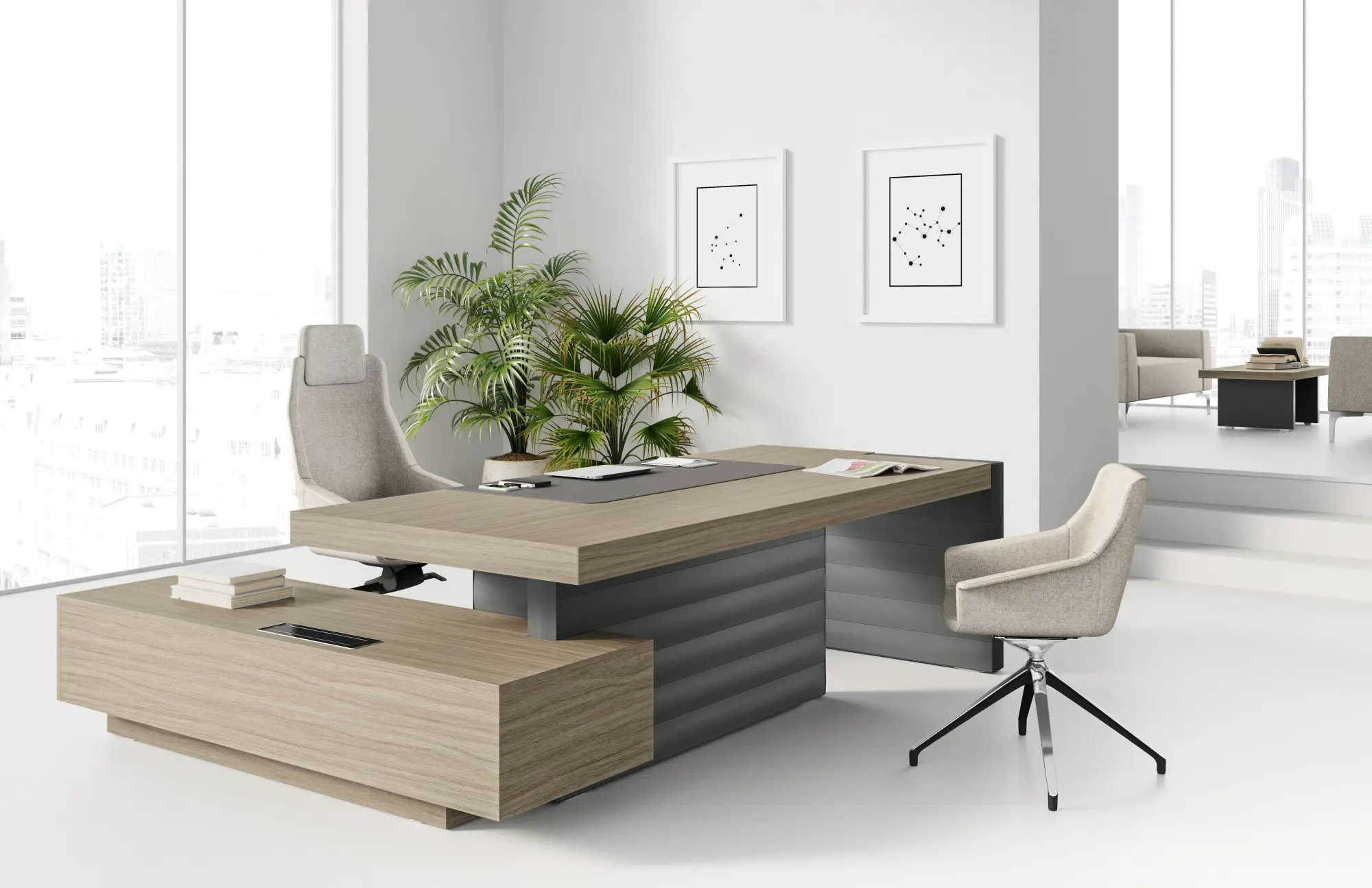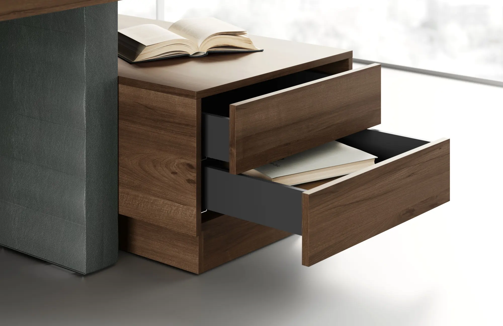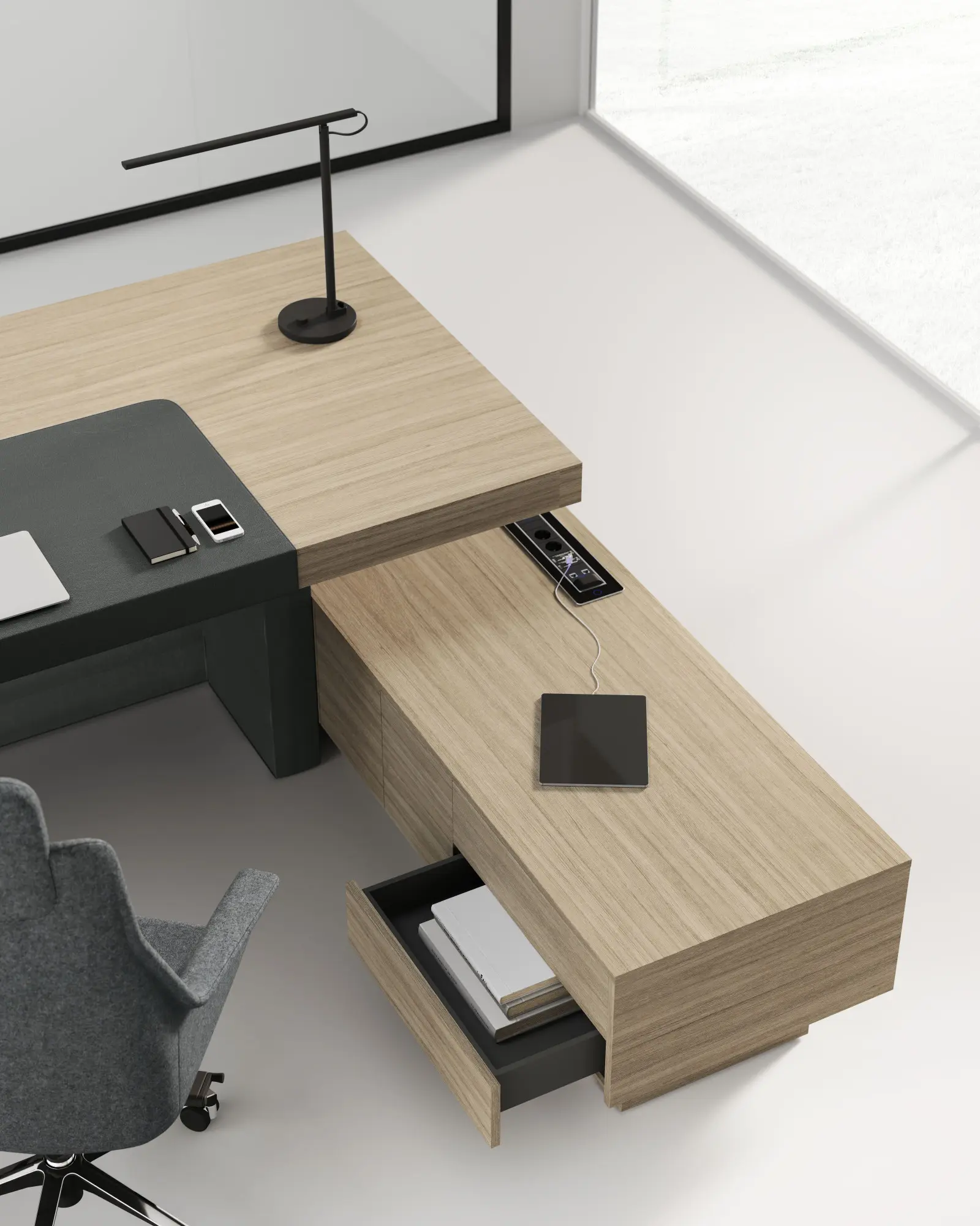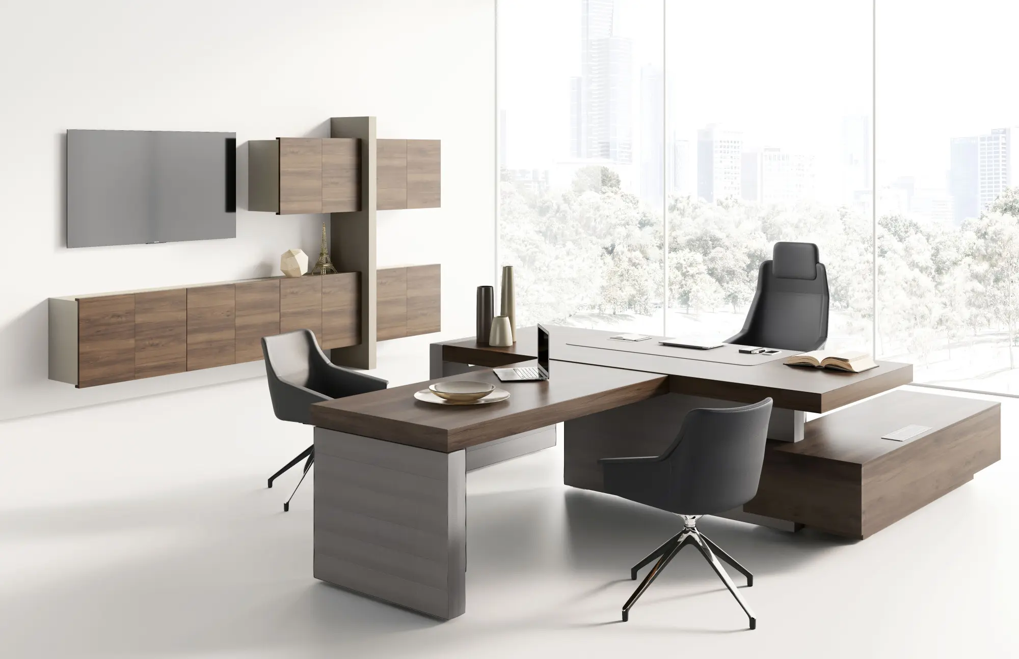 Директорския кабинет JERA съчетава изчистени и строги линии със съвременни материали, като създава усещане за уют и комфорт на работното място. Солидното и масивно бюро в комбинация със страничните и задните панели, тапицирани с еко кожа, предразполагат за продуктивност и удоволствие. Това дизайнерско решение се дължи на факта, че комбинацията от дърво и кожа има естествен характер. Предлага се в два варианта- с и без помощен модул. Плотът на бюрото е изработен от висококачествени МДФ панели, които са лесни за поддръжка и имат луксозно покритие. Работното бюро, страните и задният панел на помощния плот съставляват цялостна Т-образна структура. Иновативен елемент на кабинета е оборудването Top Access,което представлява панел за скриване на кабели и контакти. Дело е на екипа италиански дизайнери Orlandini Design.