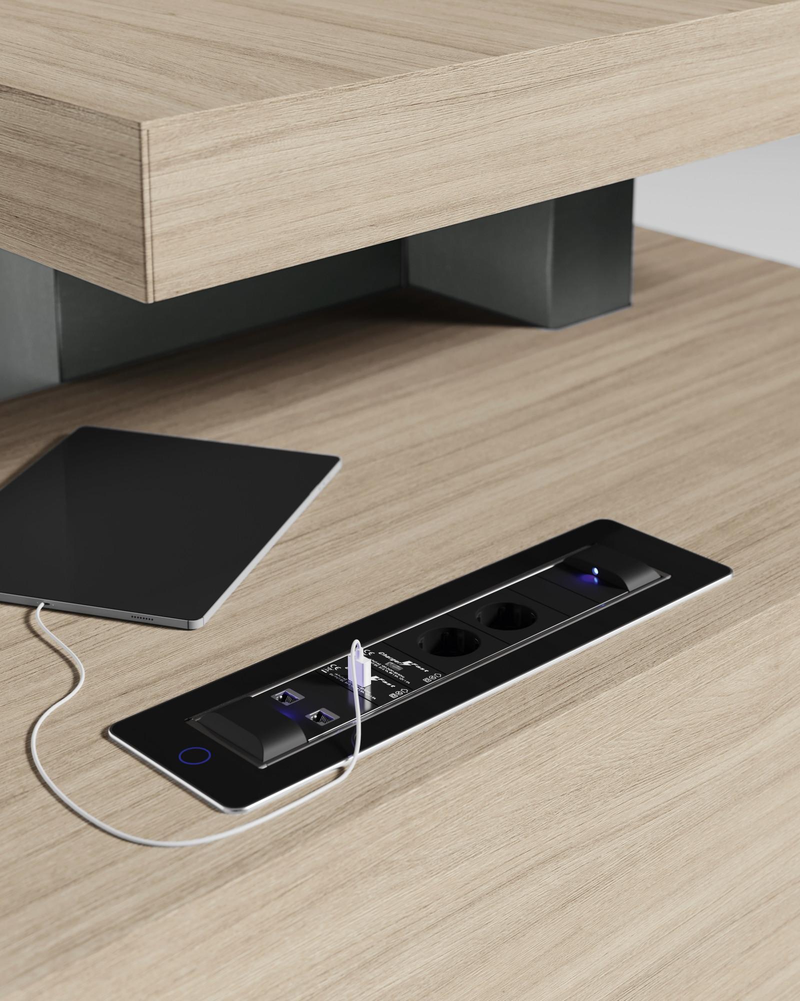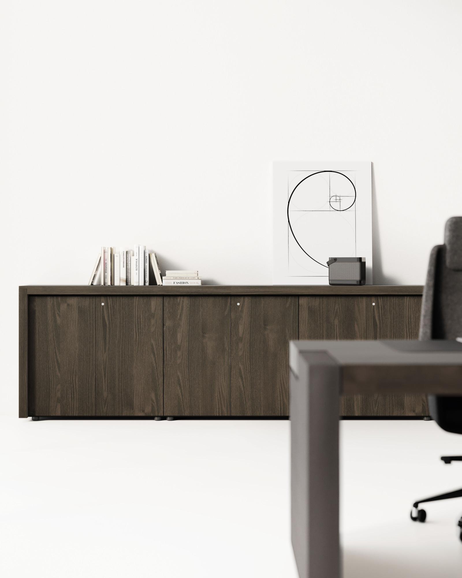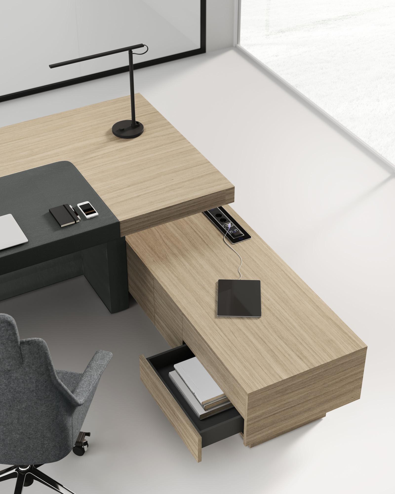 Директорския кабинет JERA съчетава изчистени и строги линии със съвременни материали, като създава усещане за уют и комфорт на работното място. Солидното и масивно бюро в комбинация със страничните и задните панели, тапицирани с еко кожа, предразполагат за продуктивност и удоволствие. Това дизайнерско решение се дължи на факта, че комбинацията от дърво и кожа има естествен характер. Предлага се в два варианта- с и без помощен модул. Плотът на бюрото е изработен от висококачествени МДФ панели, които са лесни за поддръжка и имат луксозно покритие. Работното бюро, страните и задният панел на помощния плот съставляват цялостна Т-образна структура. Иновативен елемент на кабинета е оборудването Top Access,което представлява панел за скриване на кабели и контакти. Дело е на екипа италиански дизайнери Orlandini Design.