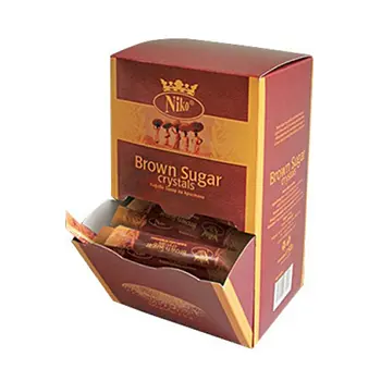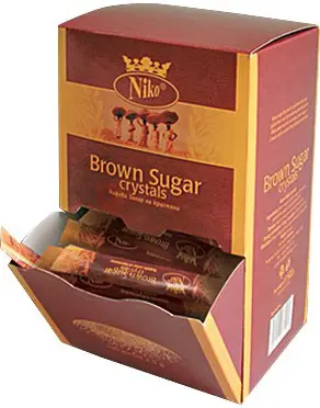 Кафява нерафинирана тръстикова захар на кристали 100%. Опаковани в пакетчета по 4 гр. в кутия с джоб.
