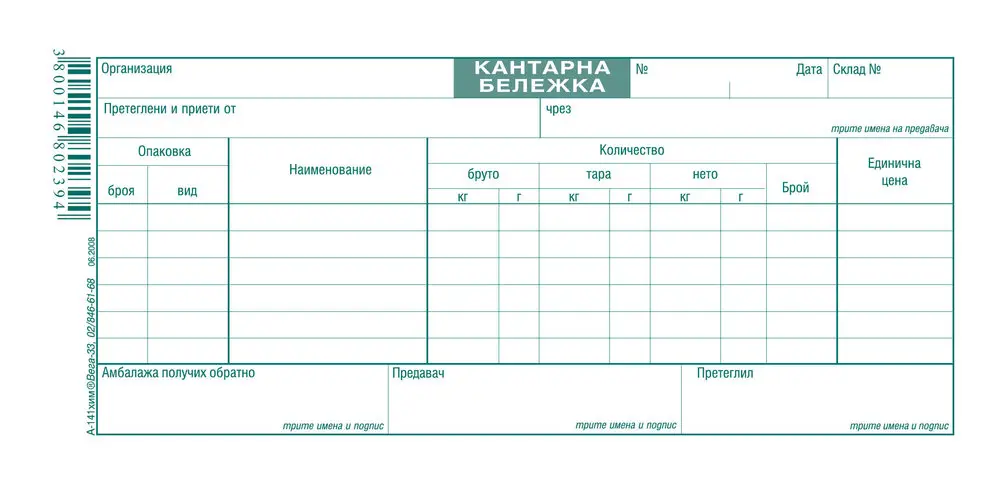 - Кантарна бележка от химизирана (самокопирна) хартия