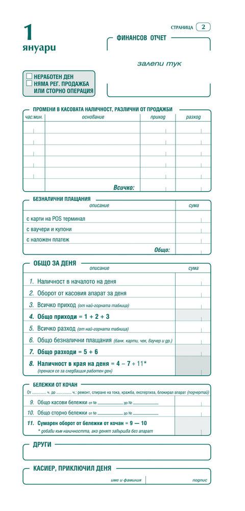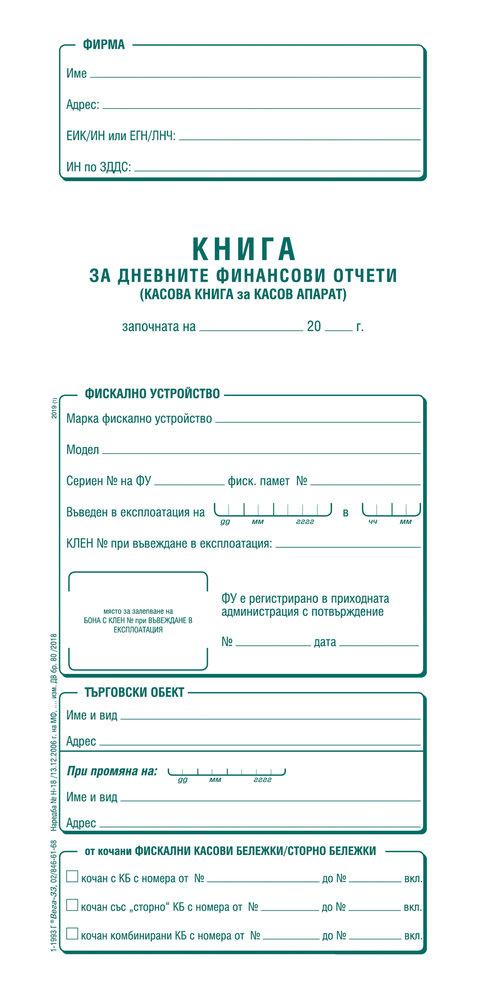 Касова книга е подходяща за дневни финансофи отчети от касов апарат. Формулярът е с мека подвързия и тяло от вестникарска хартия.