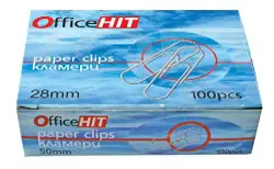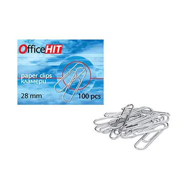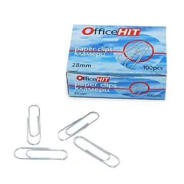 Кламери никел 28 mm – 100 броя в опаковка. Подходящи за събиране и организиране на документи в офиса, училище или у дома. Здрави, устойчиви на огъване и с никелово покритие за дълготрайна употреба.