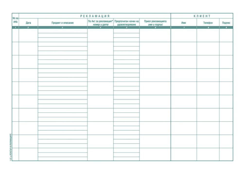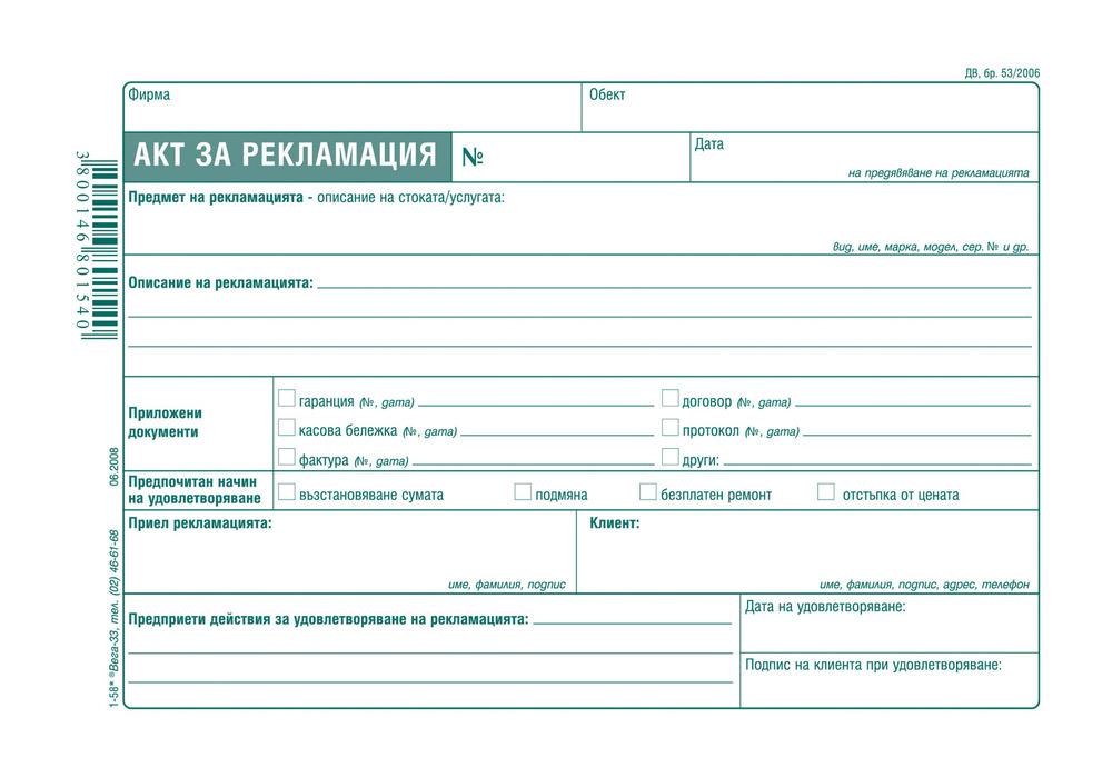 - Комплектът за рекламации съдържа 1 брой акт за рекламация и 1 брой регистър на рекламациите
