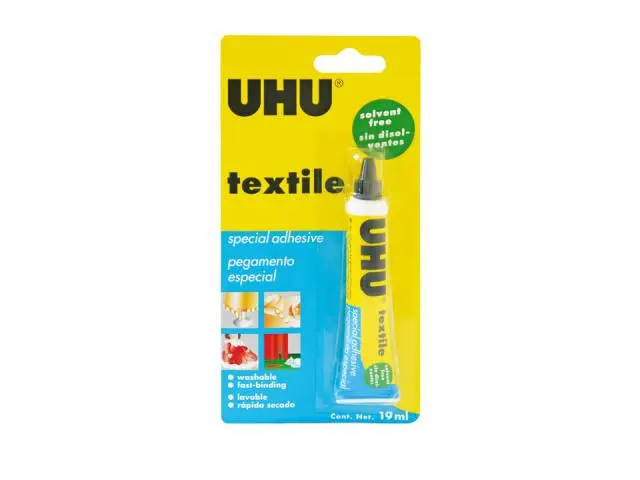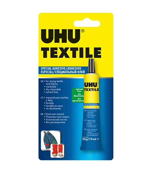 Лепилото за текстил UHU 19 мл безпроблемно залепва памук, лен, кече, плат към самия него или към кожа и дърво. Може да се пере до +90 градуса, да се глади и суши.