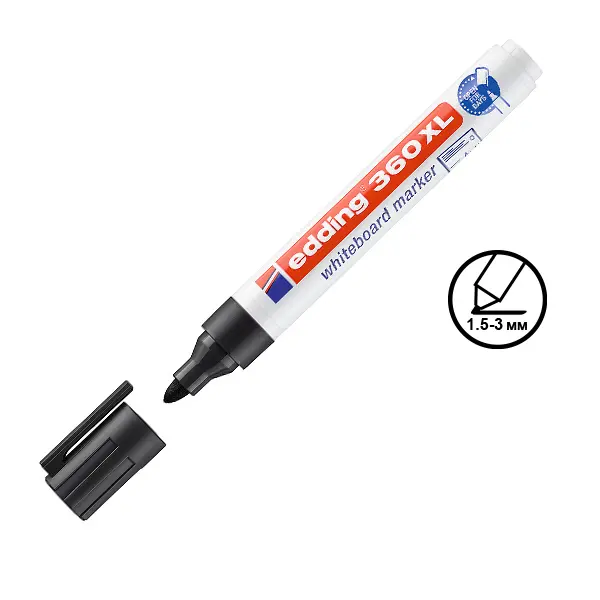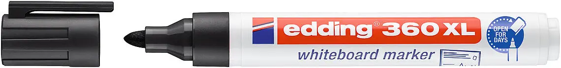 Маркерът за бяла дъска Edding E-360XL черен е подходящо за писане върху бяла дъска, стъкло, керамика и други. Може да се презарежда с помощта на мастилото Edding ВТ30.
