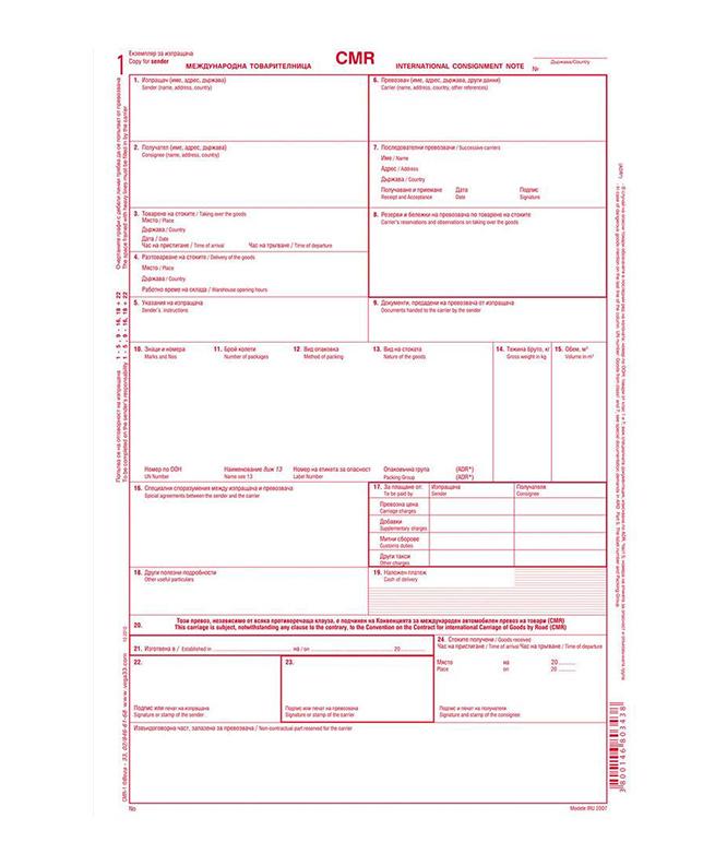 - Международна товарителница (ЧМР, CMR), образец Modele IRU 2007