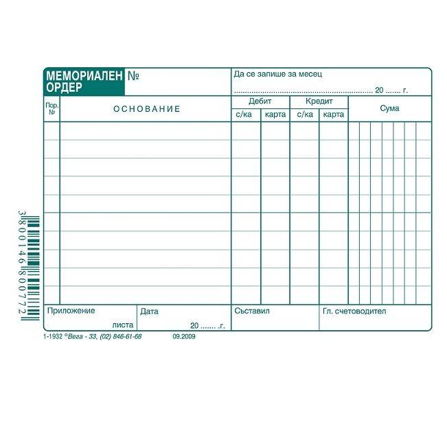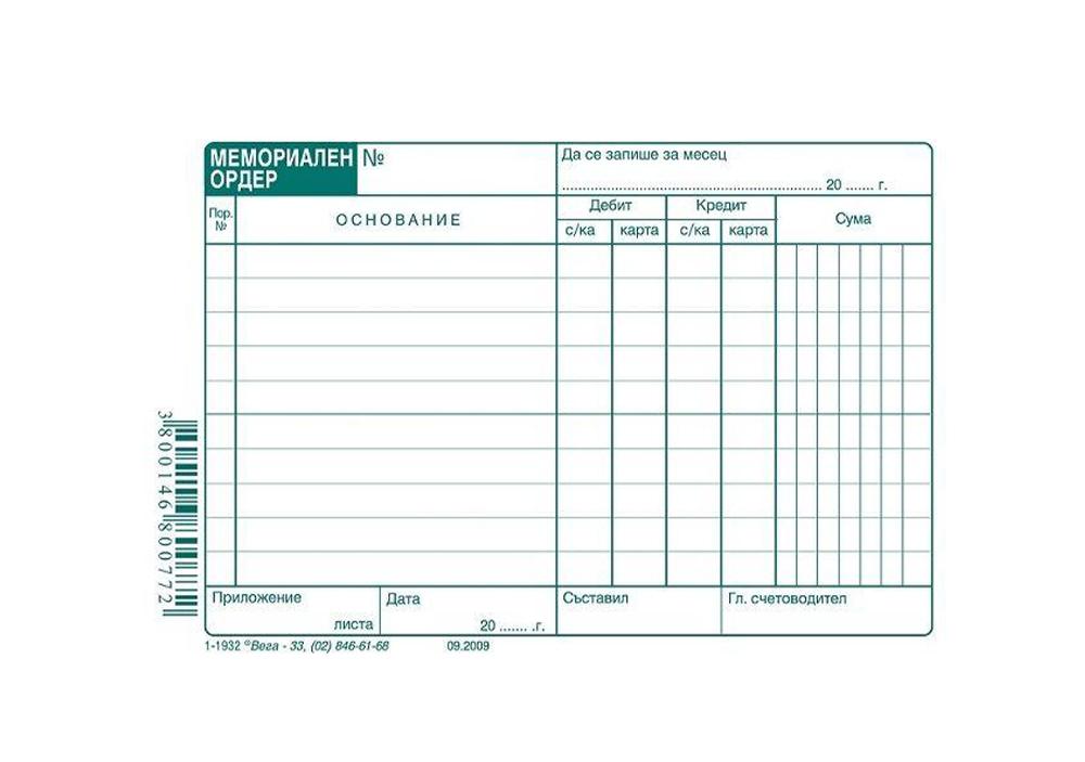 - Документ, с който се описват счетоводни статии, за които няма първичен счетоводен документ, например за преоценката на валута или приключвателните операции