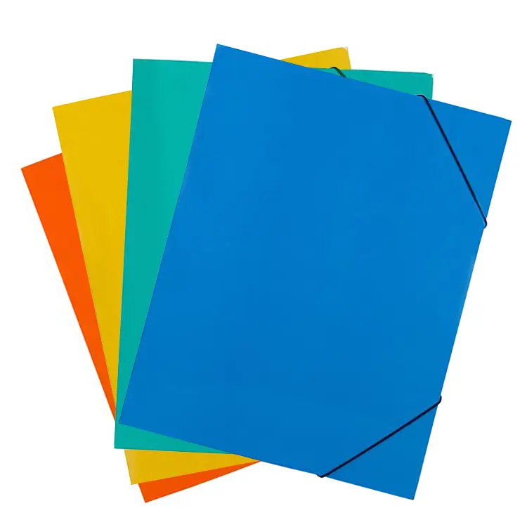 Папка картон с 3 капака е удобна за съхранение на документи с размер А4. Затварянето се осъществява с помощта на ластик. Предлага се в седем цвята.