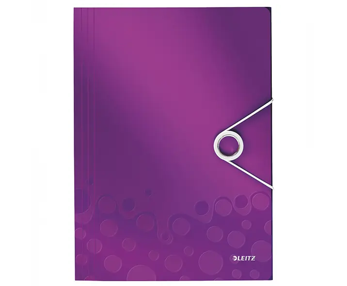 Папката с ластик и 3 капака Leitz WOW лилава е луксозна папка с преливащи цветове, която е подходяща за съхранение и архивиране на документи с размер А4.