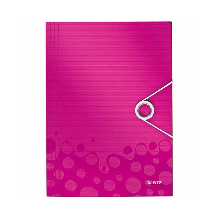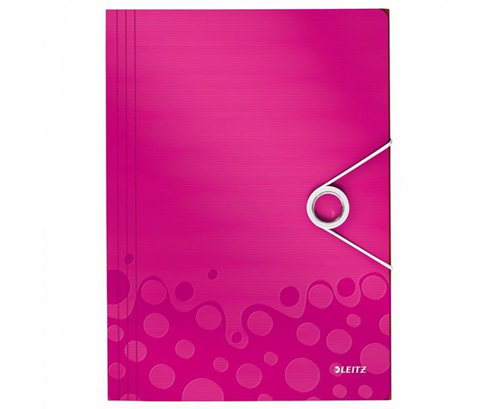 Папката с ластик и 3 капака Leitz WOW розова е луксозна папка с преливащи цветове, която е подходяща за съхранение и архивиране на документи с размер А4.