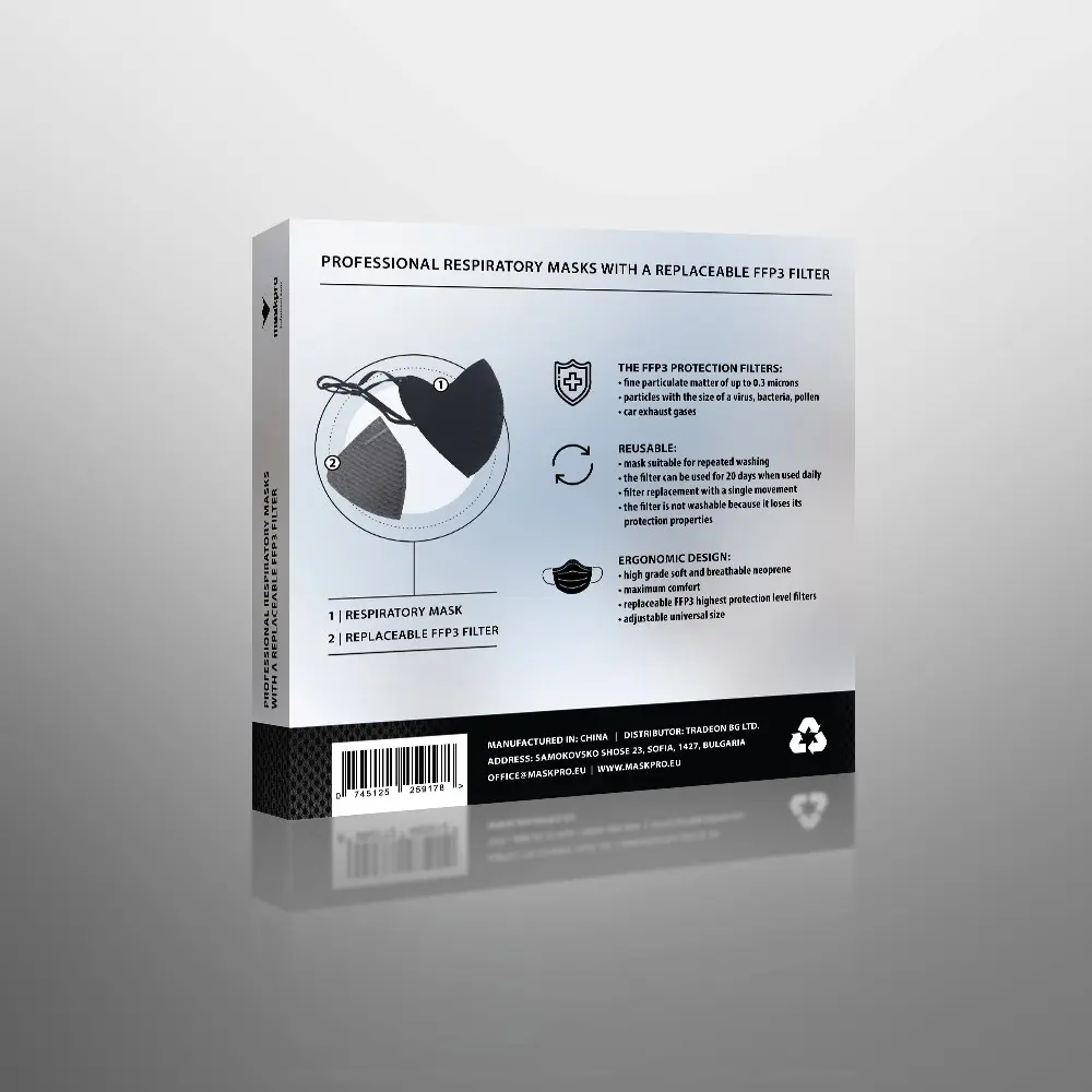 Професионалната защитна маска с FFP3 филтър е подходяща за многократна употреба и осигурява защита от вируси, прах, алергени и микроби. Маската има елегантен дизайн в черно. При поръчка на количества над 100 бр. предлагаме опцията за поставяне на фирмено лого.