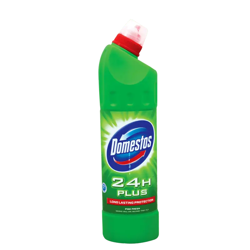 DOMESTOS 24h Plus унищожава всички микроби. Благодарение на подобрената си формула полепва по повърхността за по-дълго време след всяко пускане на водата.