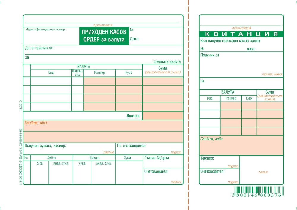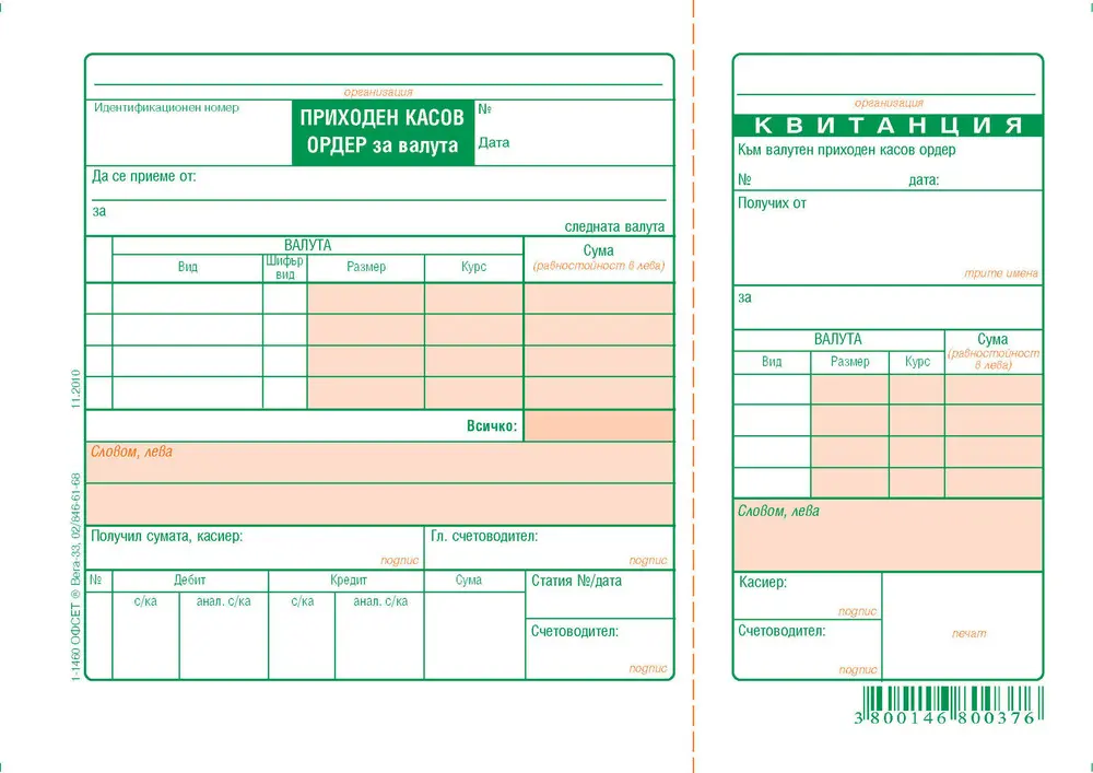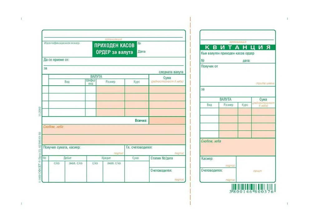 - Приходен касов ордер (ПКО) за валута, с квитанция