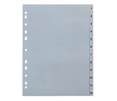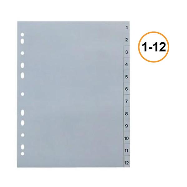 Разделителят 1-12 PP сив е подходящ за разделяне на отделни видове документи или теми. Притежава перфорация за поставяне в класьор или папка, което го прави подходящ за употреба в офиса и дома.
