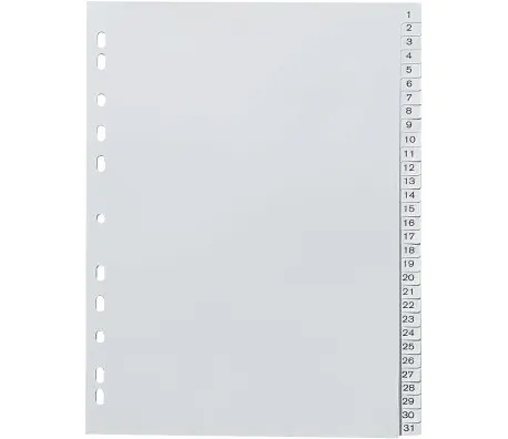 Разделителят 1-31 PP сив е подходящ за разделяне на отделни видове документи или теми. Притежава перфорация за поставяне в класьор или папка, което го прави подходящ за употреба в офиса и дома.