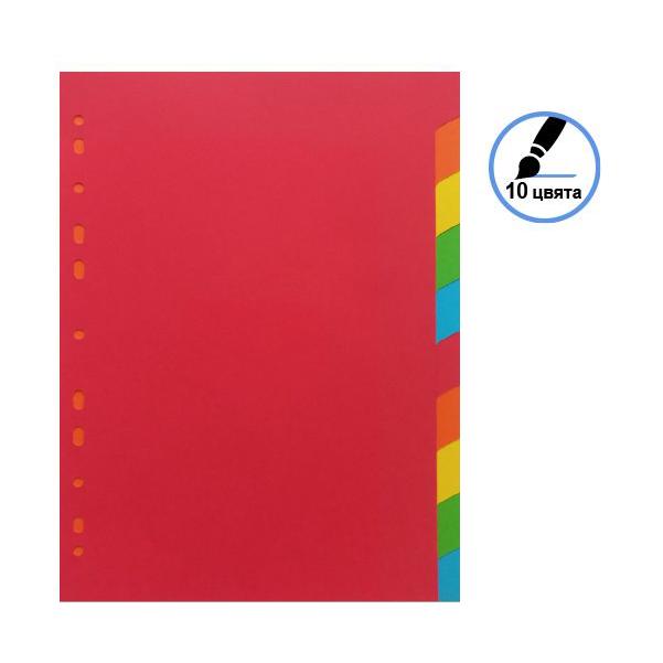 Разделителят 10 цвята картон е подходящ за разделяне на отделни видове документи или теми. Притежава перфорация за поставяне в класьор или папка, което го прави подходящ за употреба в офиса и дома.
