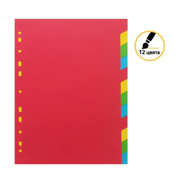 Разделителят 12 цвята картон е подходящ за разделяне на отделни видове документи или теми. Притежава перфорация за поставяне в класьор или папка, което го прави подходящ за употреба в офиса и дома.