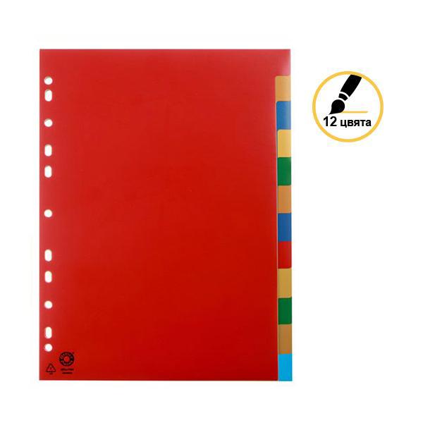 Разделителят 12 е подходящ за разделяне на отделни видове документи или теми. Притежава перфорация за поставяне в класьор или папка, което го прави подходящ за употреба в офиса и дома. цвята РР