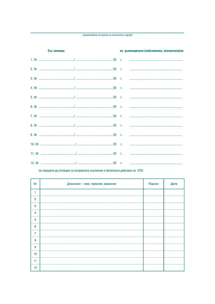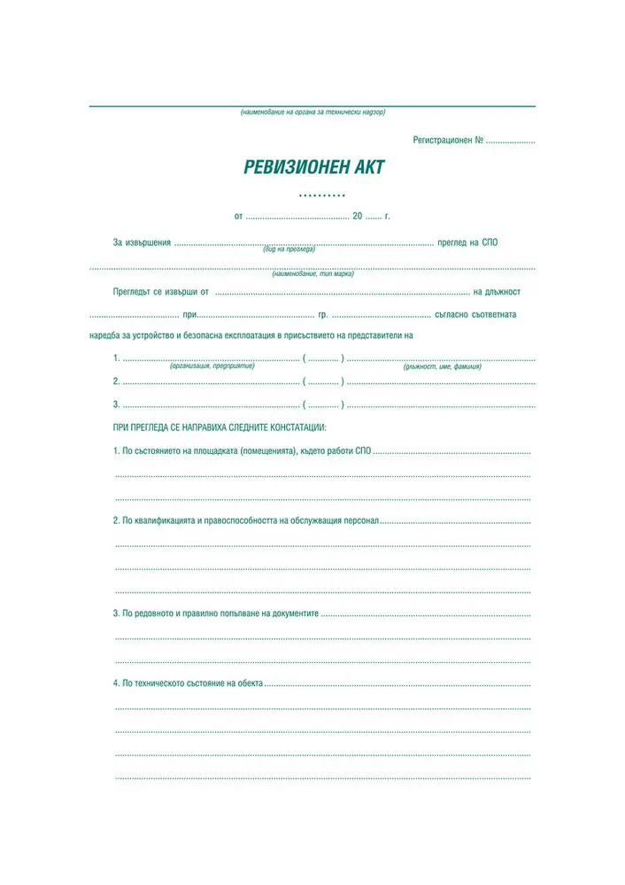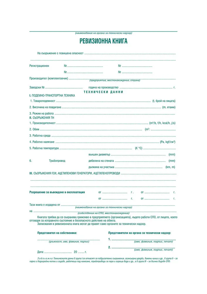 Ревизионна книга на съоръжения с повишена опасност (СПО). Използва се за асаньори, парни котли и други.
