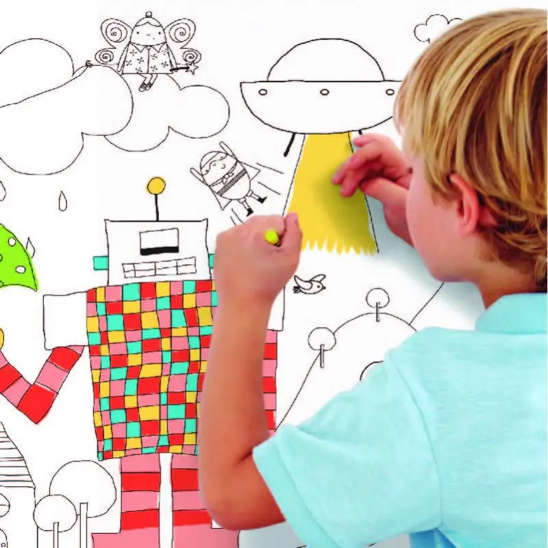 Самозалепващата ролка за оцветяване, 4х0.3 м може да се залепва и отлепва неограничен брой пъти върху маса, стена и други равни повърхности. Разполага с бяло поле, което дистанцира полето за рисуване от стената и я предпазва от случайно надраскване