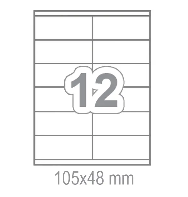 Самозалепващи етикети 105x48 12 бр. са произведени от самозалепваща хартия за многофункционална употреба. Подходящи са за работа с копирни машини, лазерни и мастиленоструйни принтери.