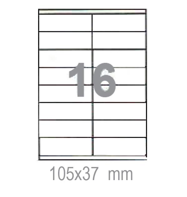 Самозалепващи етикети 105х37 16 бр. са произведени от самозалепваща хартия за многофункционална употреба. Подходящи са за работа с копирни машини, лазерни и мастиленоструйни принтери.