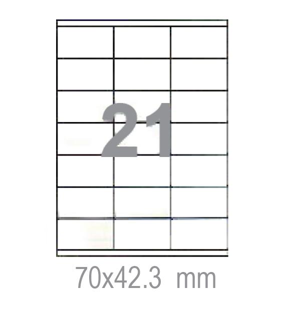 Самозалепващи етикети 70х42.3 21 бр. са произведени от самозалепваща хартия за многофункционална употреба. Подходящи са за работа с копирни машини, лазерни и мастиленоструйни принтери.