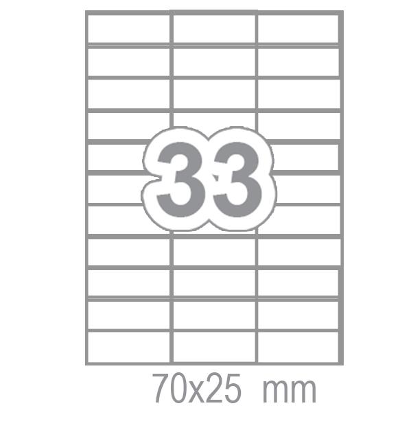 Самозалепващи етикети 70х25 33 бр. са произведени от самозалепваща хартия за многофункционална употреба. Подходящи са за работа с копирни машини, лазерни и мастиленоструйни принтери.