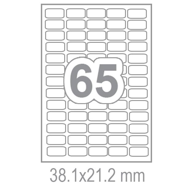 Самозалепващи етикети 38.1x21.2 65 бр. са произведени от самозалепваща хартия за многофункционална употреба. Подходящи са за работа с копирни машини, лазерни и мастиленоструйни принтери.
