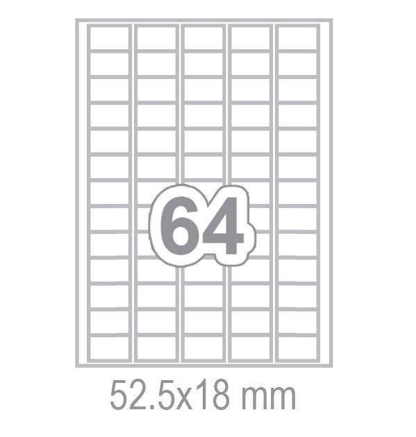 Самозалепващи етикети 52.5x18 64 бр. са произведени от самозалепваща хартия за многофункционална употреба. Подходящи са за работа с копирни машини, лазерни и мастиленоструйни принтери.